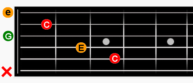 Wir wissen, dass der C-Dur Akkord aus den Tönen C E und G besteht.Um die Töne eines Akkordes am Griffbrett zu finden, muss man zu allererst die Töne der LEEREN Saiten kennen.