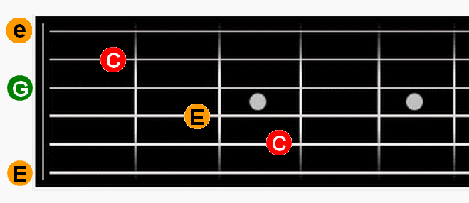 Wir wissen, dass der C-Dur Akkord aus den Tönen C E und G besteht.Um die Töne eines Akkordes am Griffbrett zu finden, muss man zu allererst die Töne der LEEREN Saiten kennen.
